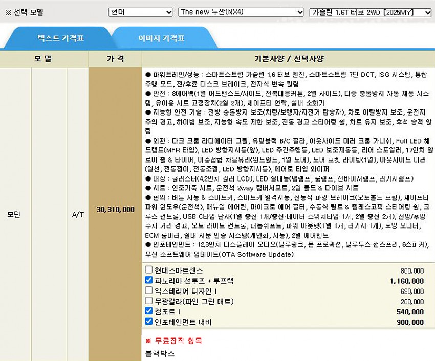 ▶ 차종 및 등급 : 현대 투싼 가솔린 1.6 터보_2WD_DCT 모던_25MY