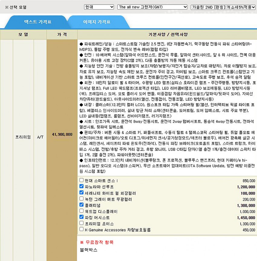 ▶ 차종 및 등급 : 더 올 뉴 그랜저 가솔린 2WD 스마트스트림 2.5 프리미엄