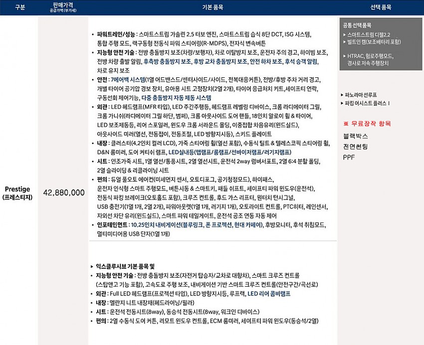 파노라마 썬루프 등 + 블랙박스 / 전면썬팅 (아래 옵션사항 참조)