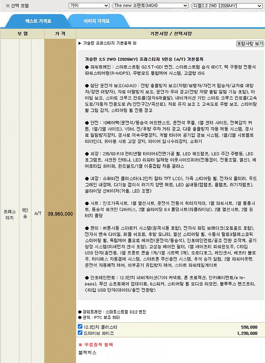 ▶ 차종 및 등급 : 더뉴 쏘렌토 디젤 2.2_2WD_프레스티지 5인승_26MY