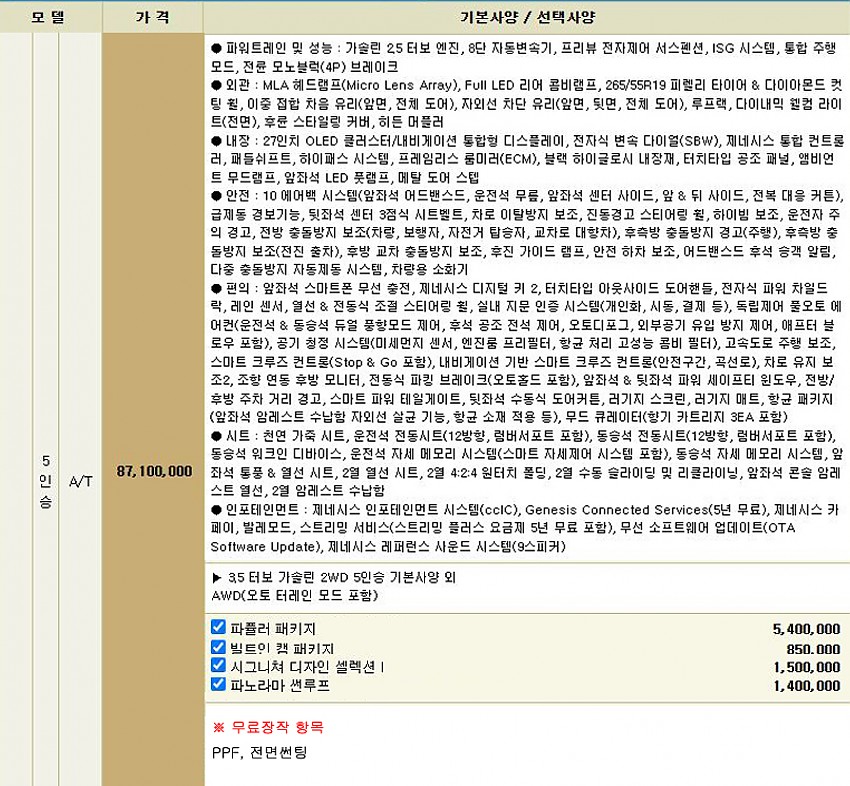 파노라마 썬루프 등 / 전면썬팅 + PPF (아래 옵션사항 참조)