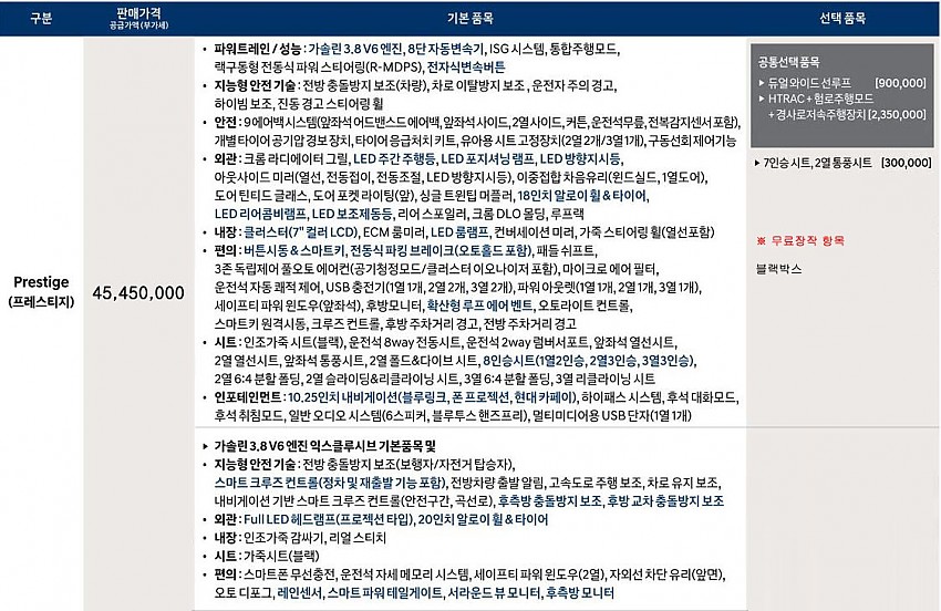 ▶ 차종 및 등급 : 현대 팰리세이드 3.8 가솔린 AWD_프레스티지 7인승