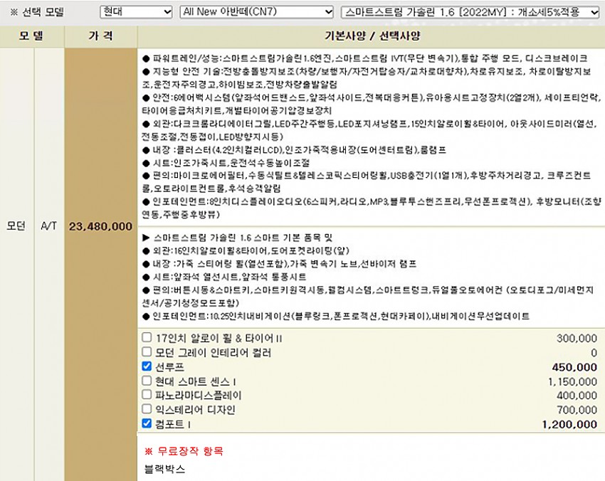 썬루프 + 컴포트 | / 블랙박스 (아래 옵션사항 참조)