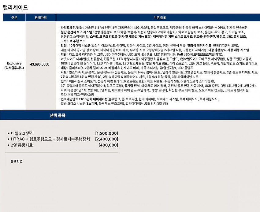 ▶ 차종 및 등급 : 더뉴 팰리세이드 디젤 2.2 / 4WD 익스클루시브 7인승