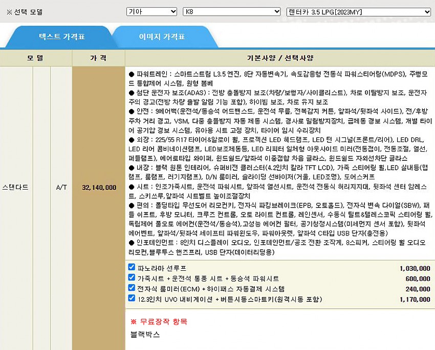 ▶ 차종 및 등급 : 기아 K8 렌터카 3.5 LPG / 스탠다드 2023MY