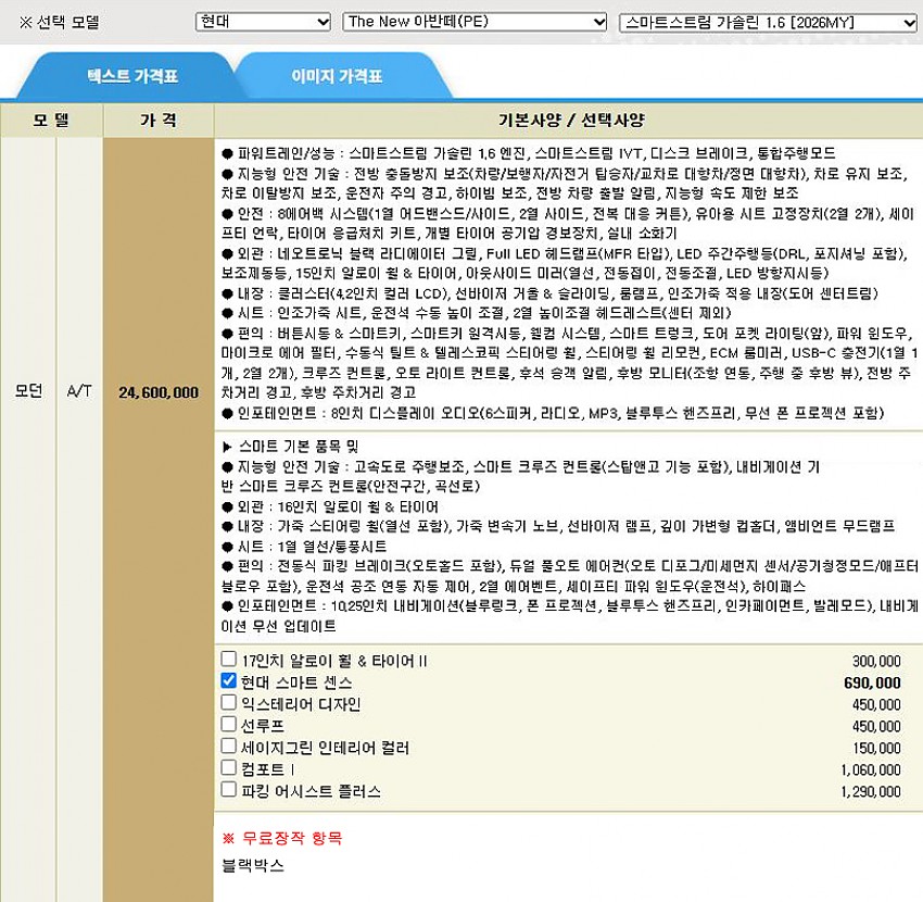▶ 차종 및 등급 : 더 뉴 아반떼_스마트스트림 가솔린 1.6_모던_2026MY