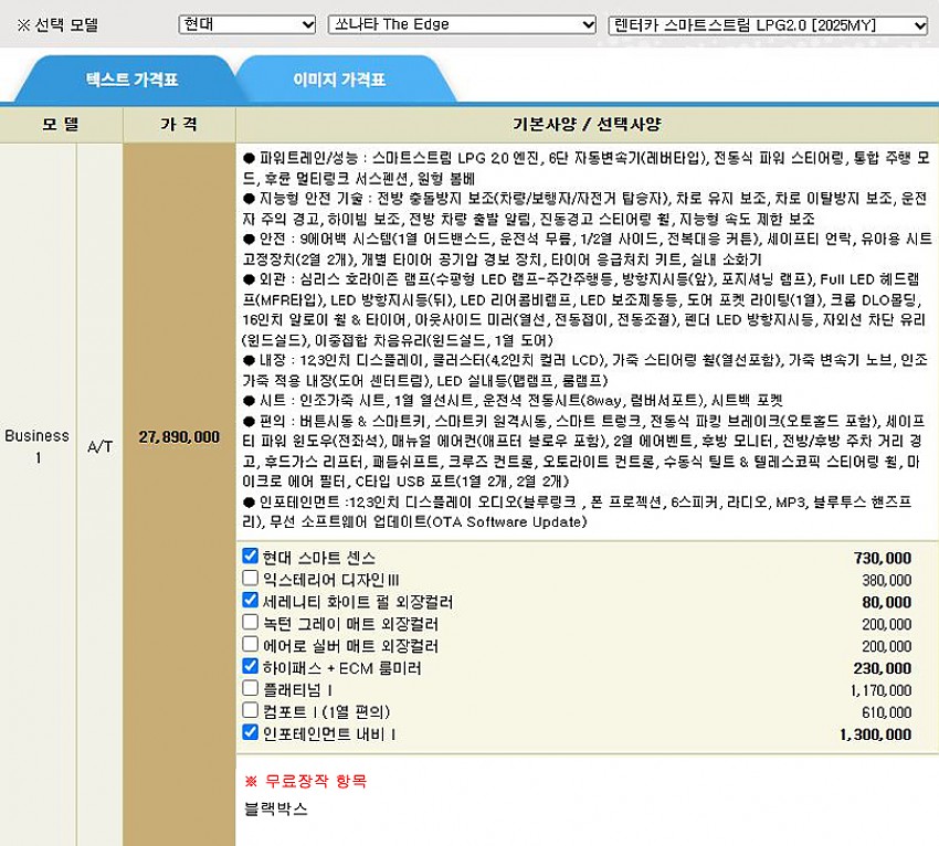 ▶ 차종 및 등급 : 쏘나타 더엣지 렌터카 스마트스트림_LPG 2.0_비지니스 1_25MY