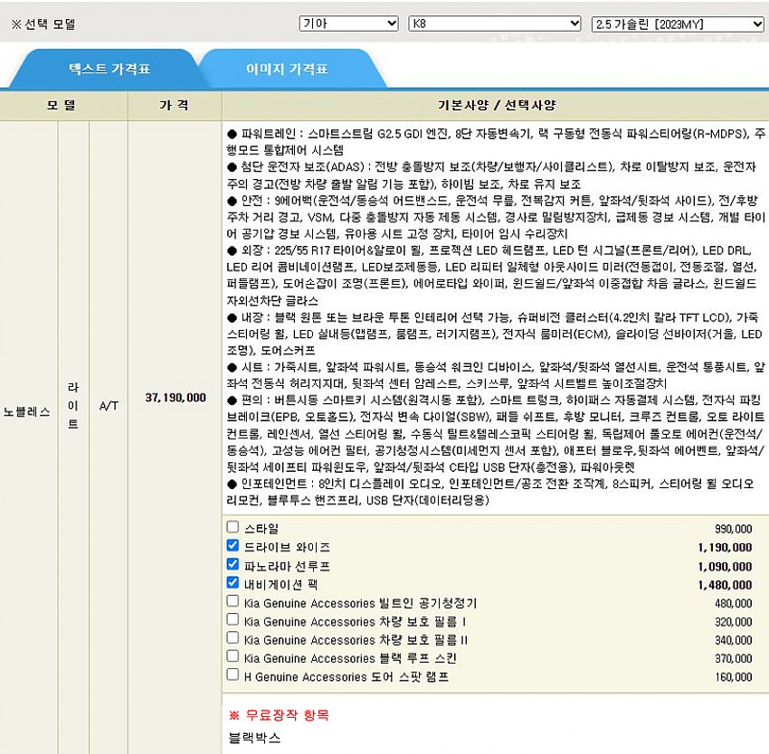 ▶ 차종 및 등급 : 기아 K8 2.5 가솔린_노블레스 라이트 (A/T 2023MY )