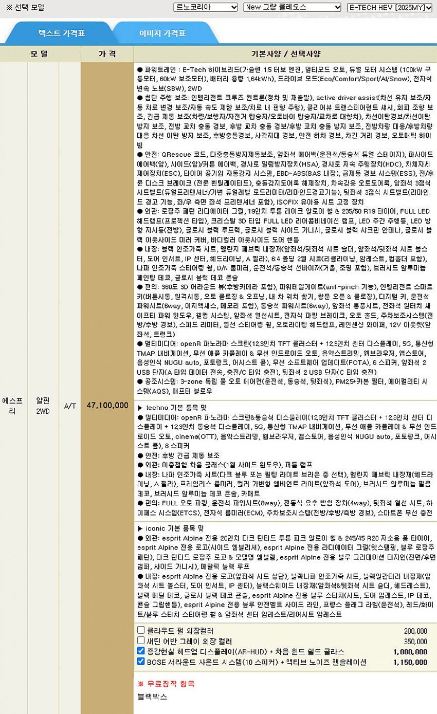 ▶ 차종 및 등급 : 그랑 콜레오스 E-Tech 하이브리드 에스프리 알핀 2WD
