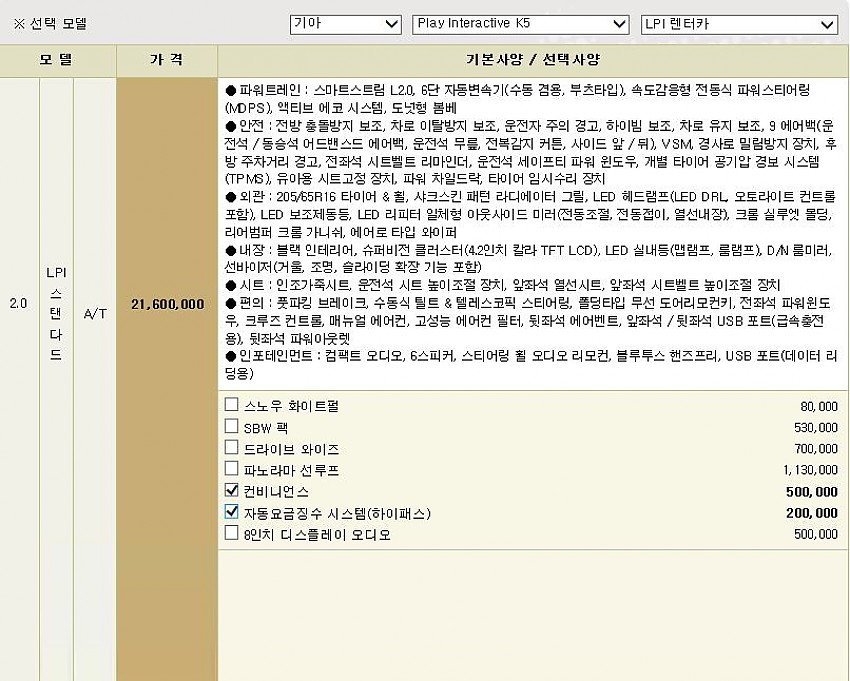 ▶ 차종 및 등급 : 기아 Play Interactive K5 LPe / 스탠다드