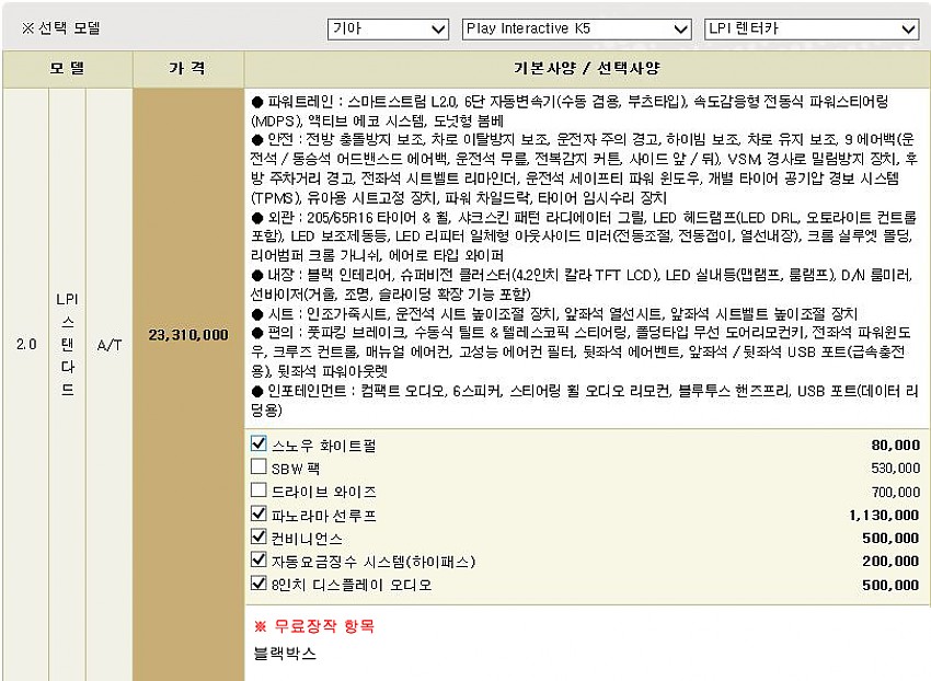 ▶ 차종 및 등급 : 기아 플레이 인터렉티브 K5 / 2.0 LPI 스탠다드 [2020MY]