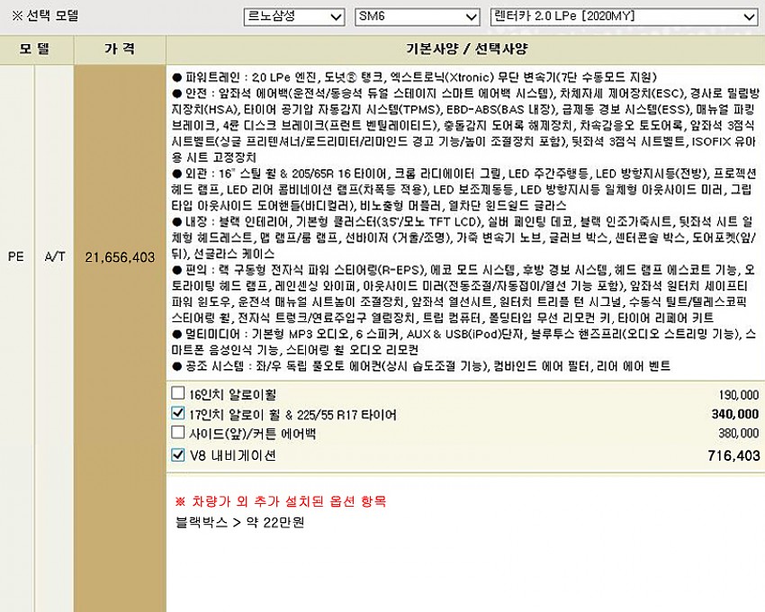 ▶ 차종 및 등급 : 르노삼성 SM6 2.0 LPe / PE [2020MY]