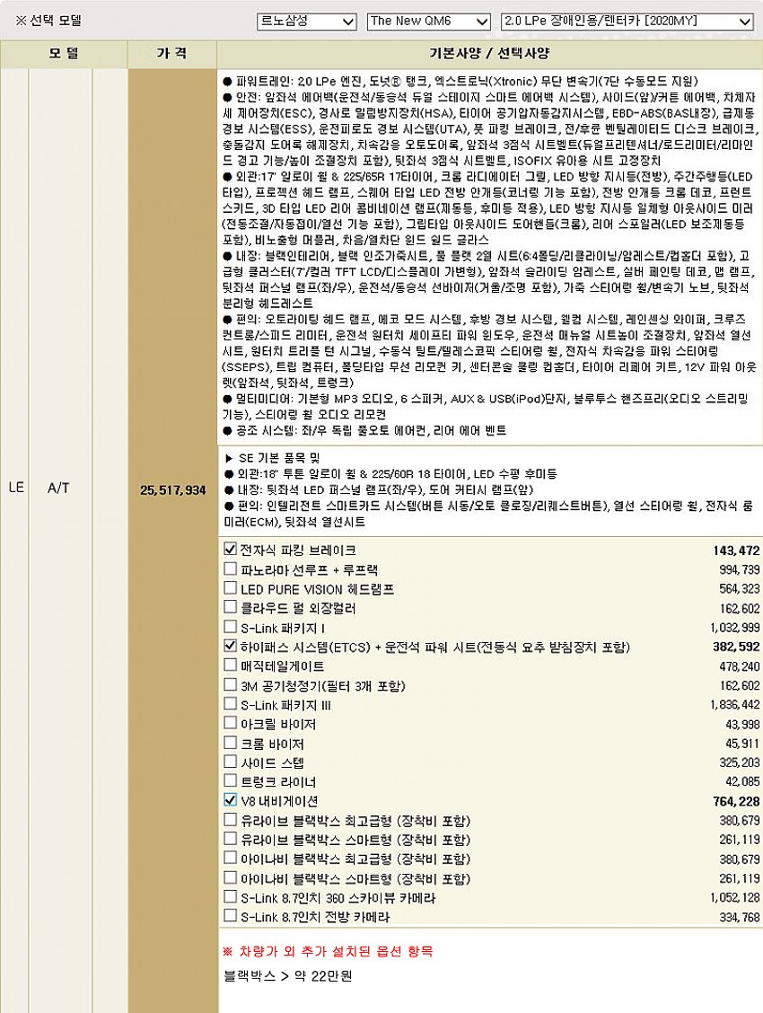 ▶ 차종 및 등급 : 르노삼성 QM6 2.0 LPe 2WD / LE [2020MY]