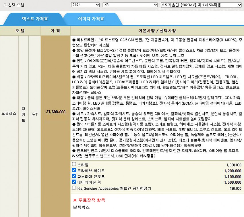 ▶ 차종 및 등급 : 기아 K8 2.5 가솔린 / 노블레스 라이트 2023MY