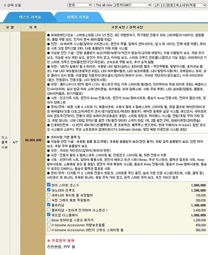 파노라마썬루프, 현대스마트센스 || 등 (아래 옵션사항 참조)
