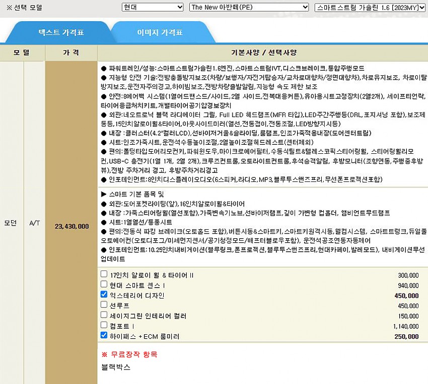 ▶ 차종 및 등급 : 더 뉴 아반떼_스마트스트림 가솔린 1.6_모던_2023MY