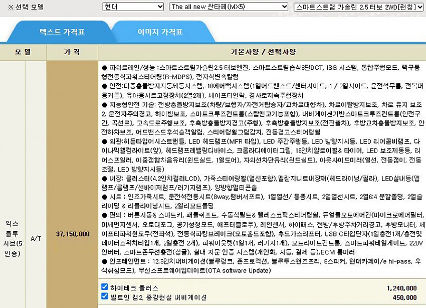 ▶ 차종 및 등급 : 싼타페 가솔린 2.5 T_2WD_5인승 익스클루시브