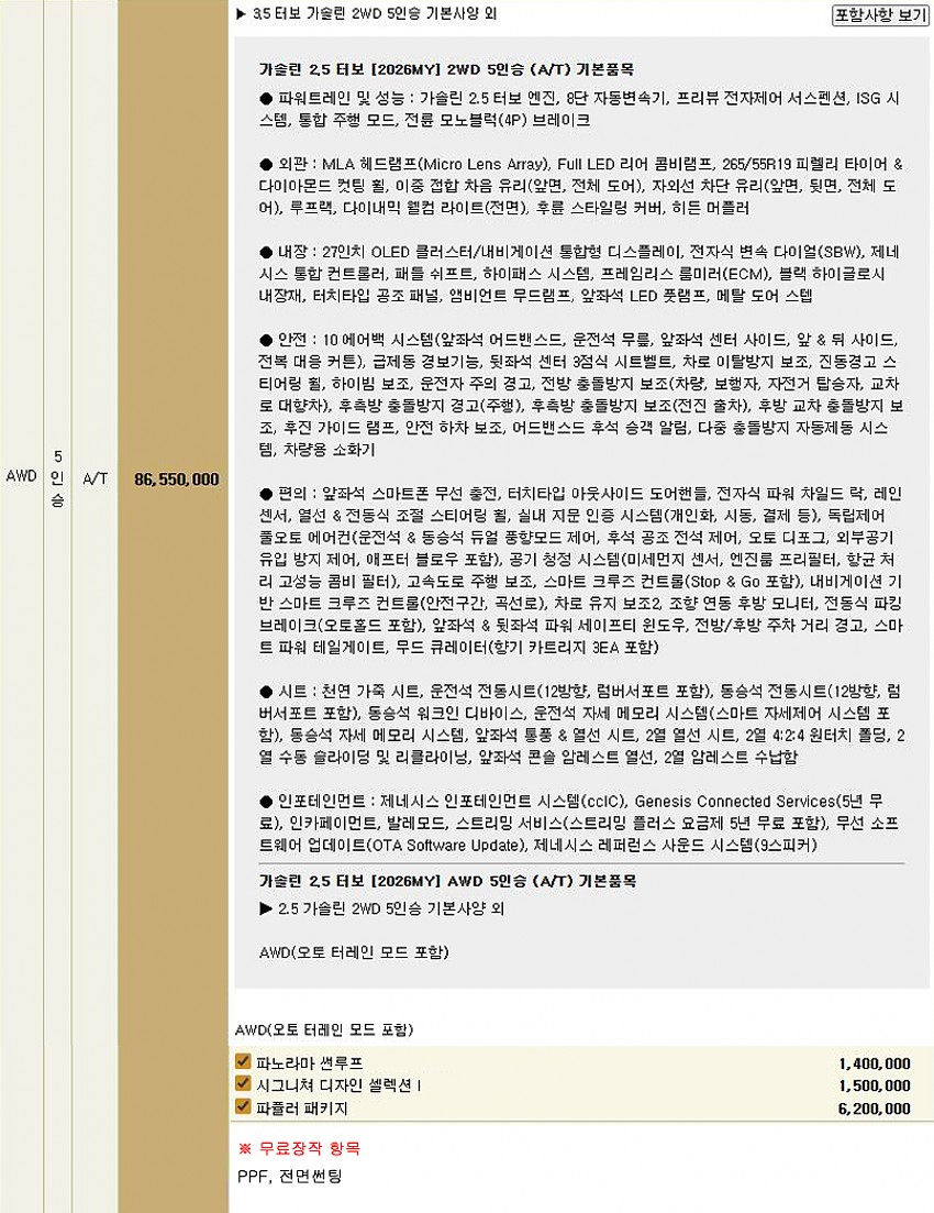 ▶ 차종 및 등급 : GV80 가솔린 3.5 터보_AWD_5인승_26MY