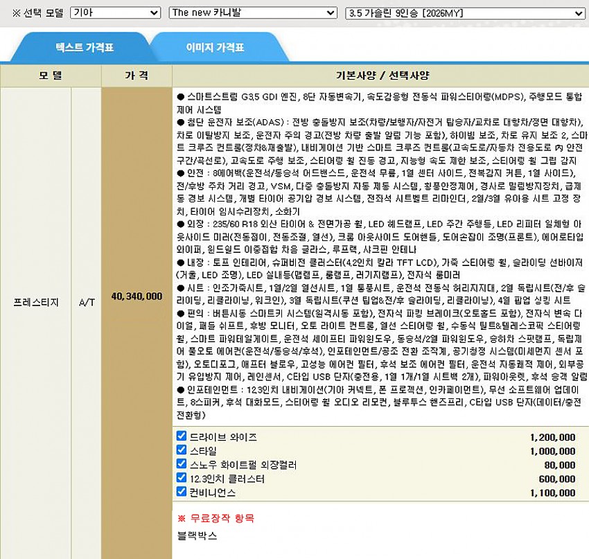 ▶ 차종 및 등급 : 더 뉴 카니발 3.5_가솔린_9인승 프레스티지_26MY