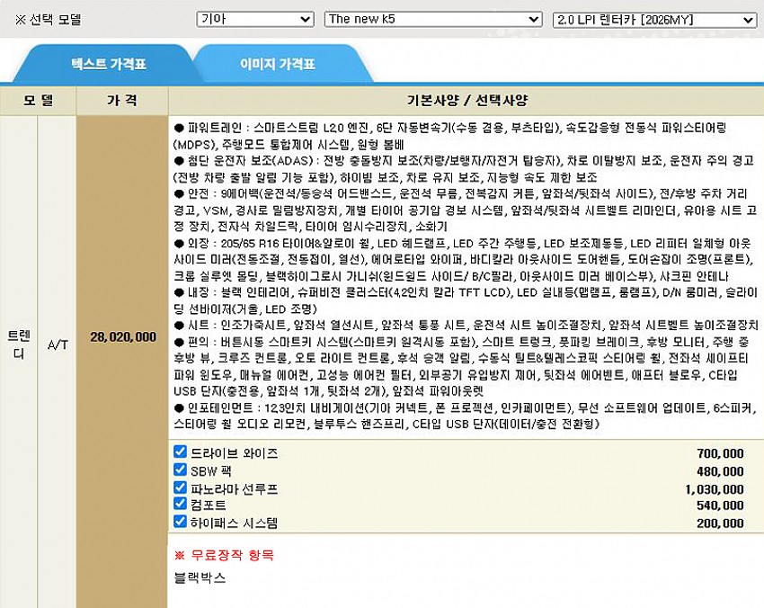 ▶ 차종 및 등급 : 기아 더 뉴 K5_2.0_LPI_렌터카_트렌디_26MY