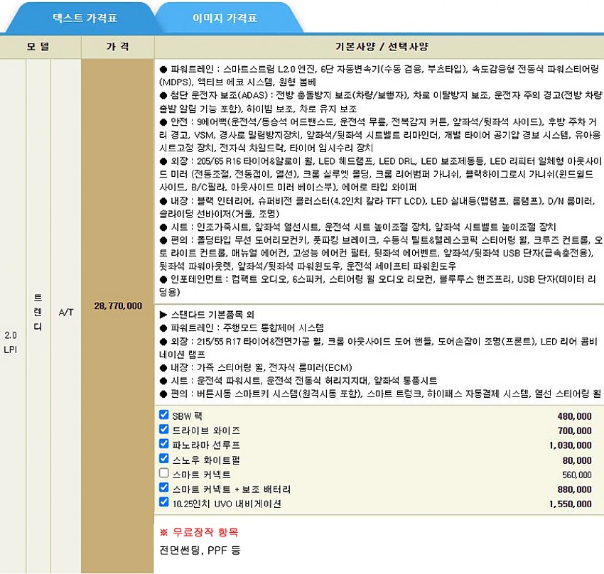 SBW팩 + 썬루프 등 / 전면썬팅, PPF 등 (아래 옵션사항 참조)