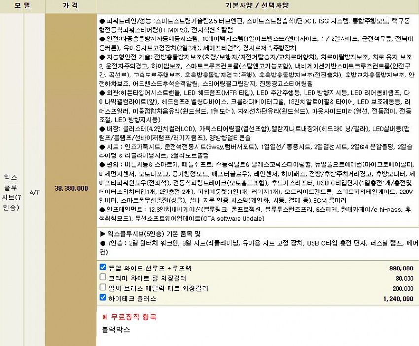 듀얼와이드썬루프 + 하이테크플러스 / 블랙박스(아래 옵션사항 참조)