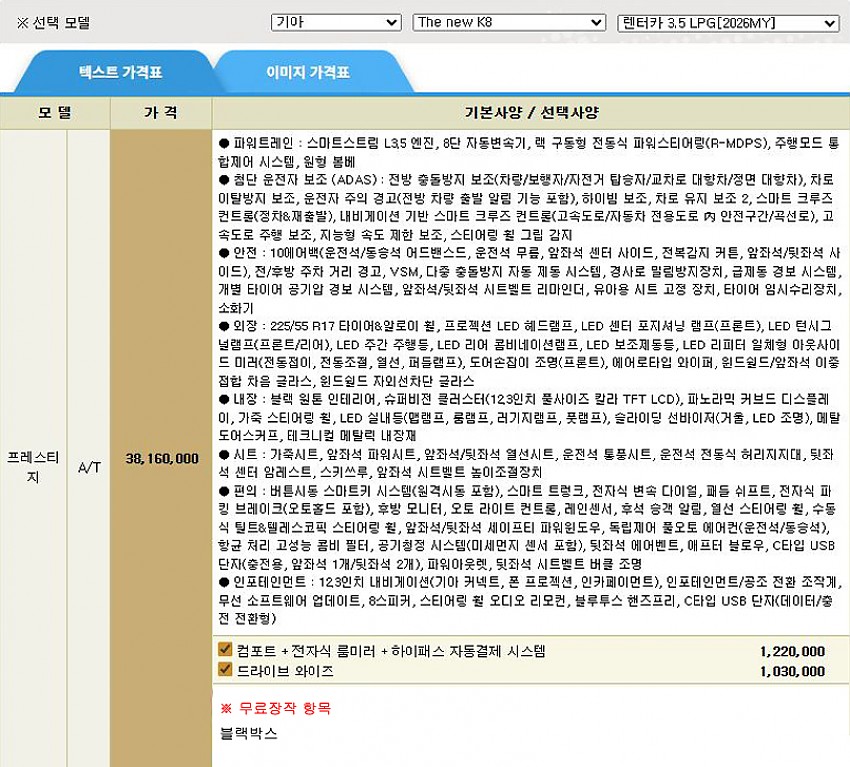 ▶ 차종 및 등급 : 더 뉴 K8 렌터카_3.5_LPG_프레스티지_26MY