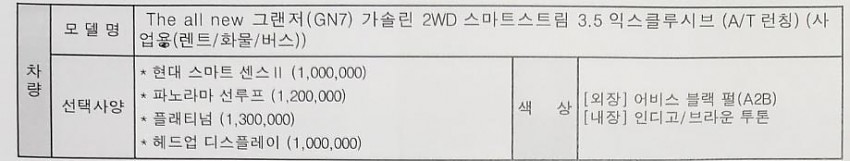 ▶ 차종 및 등급 : 더 올 뉴 그랜저 가솔린 2WD 스마트스트림 3.5 익스클루시브