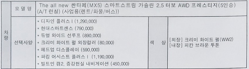 ▶ 차종 및 등급 : 싼타페_가솔린_2.5T_AWD_프레스티지_5인승