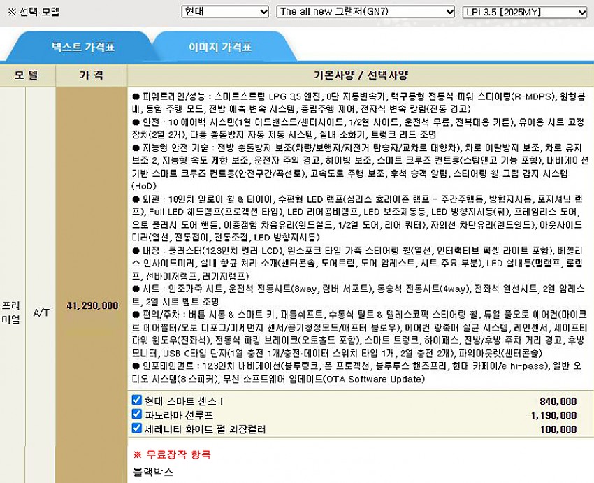 ▶ 차종 및 등급 : 그랜저 GN7_3.5LPi_2WD_프리미엄_25MY