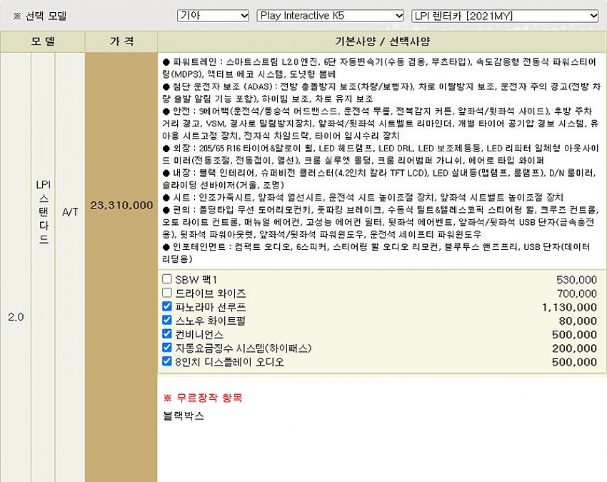▶ 차종 및 등급 : 기아 플레이 인터렉티브 K5 / 2.0 LPI 스탠다드 [2021MY]