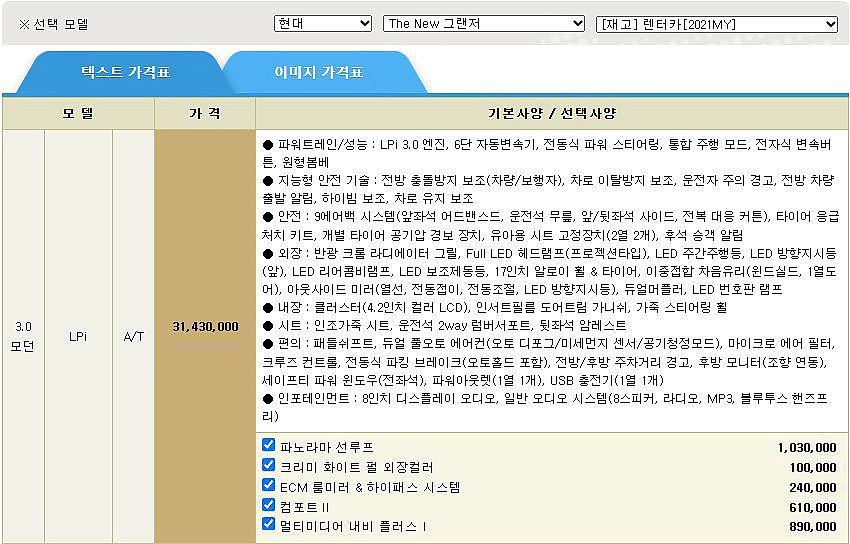 ▶ 차종 및 등급 : 그랜저 렌터카 LPG 3.0 모던 21MY