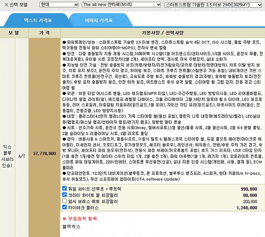 ▶ 차종 및 등급 : 싼타페 가솔린_2.5T_2WD_5인승_익스클루시브_25MY