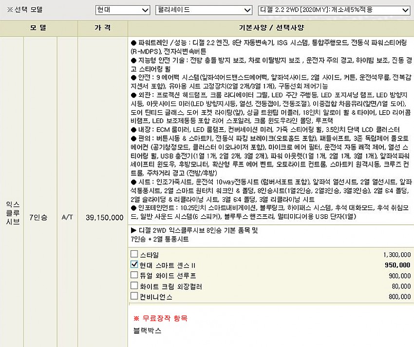 ▶ 차종 및 등급 : 현대 팰리세이드 2.2 디젤 2WD_7인승 / 익스클루시브 [2020MY]