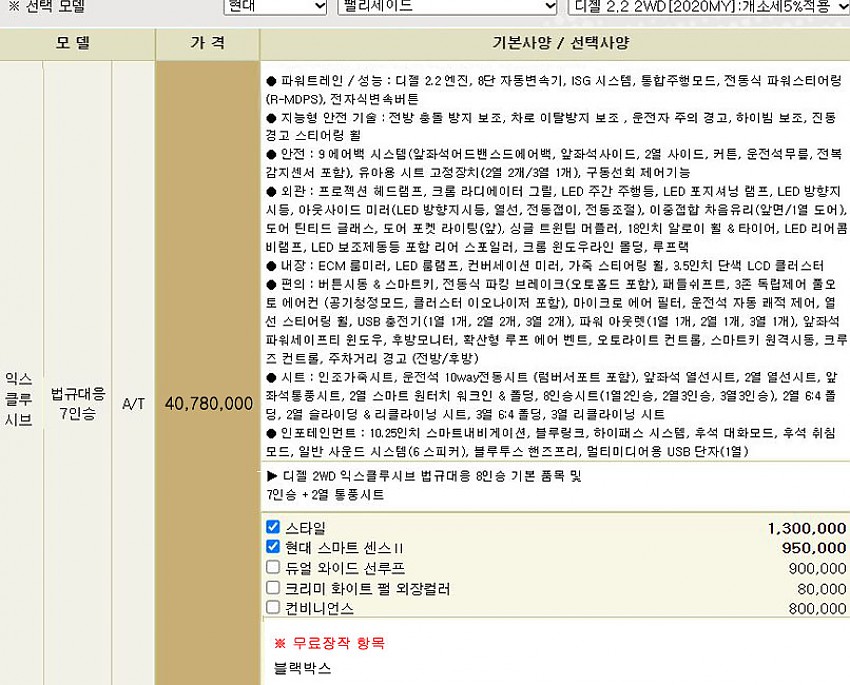 스타일 + 현대스마트센스 || / 블랙박스 (아래 옵션사항 참조)