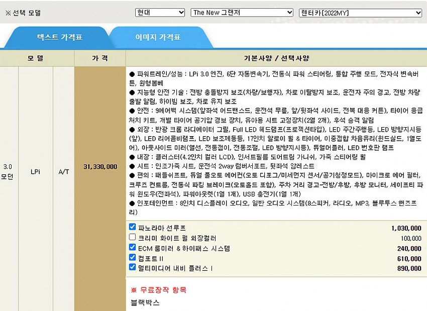 컴포트|| + 멀티미디어 내비플러스 | + 파노라마썬루프 / 블랙박스 등 (아래 옵션사항 참조)
