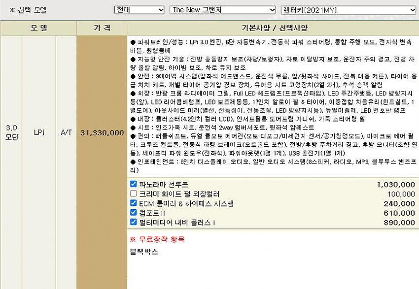 컴포트|| + 멀티미디어 내비플러스 | + 파노라마썬루프 / 블랙박스 등 (아래 옵션사항 참조)