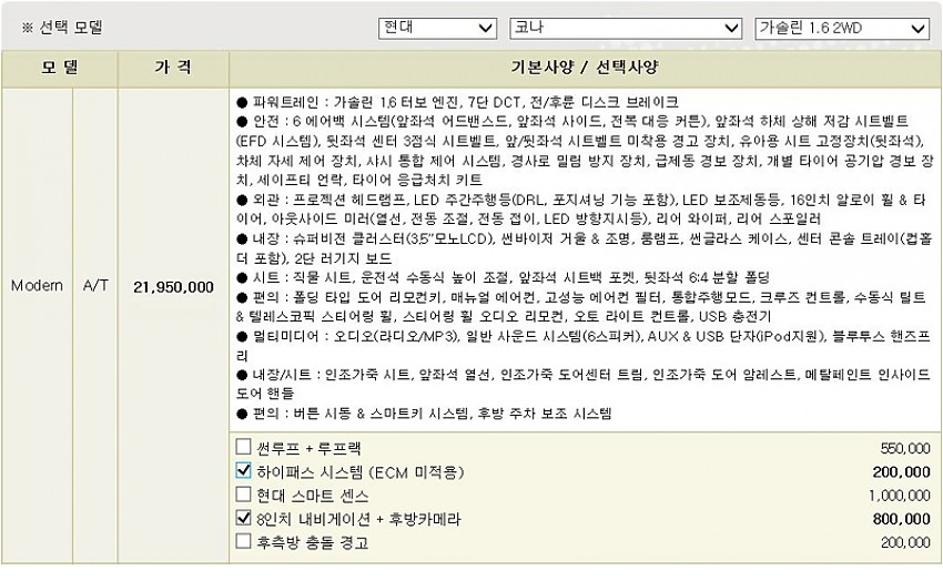 ▶ 차종 및 등급 : 현대 코나 / 가솔린 1.6 2WD 모던 등급