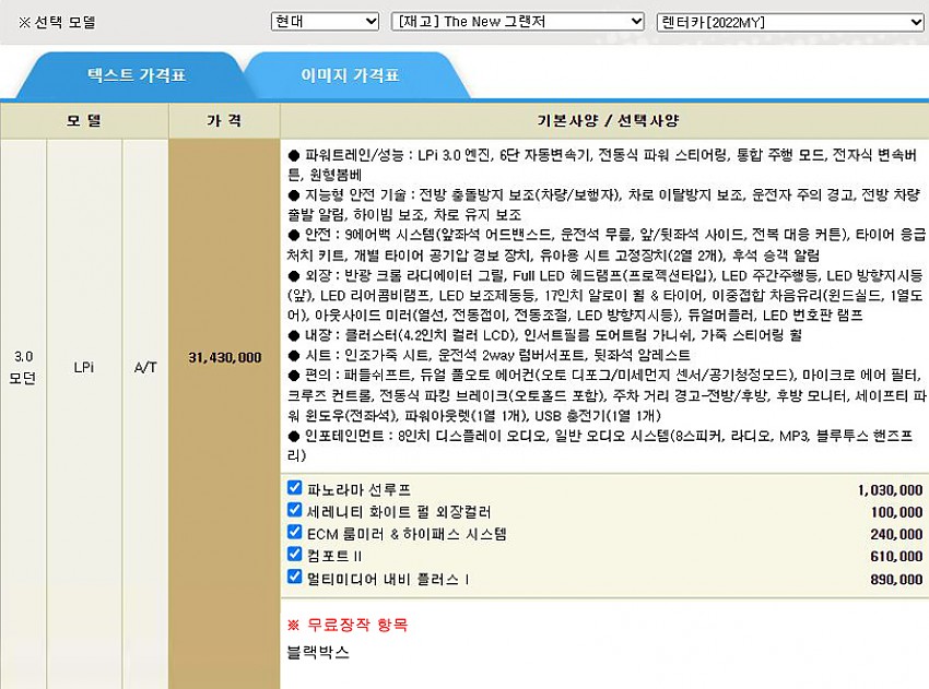 썬루프, 컴포트|| 등 + 블랙박스 (아래 옵션사항 참조)