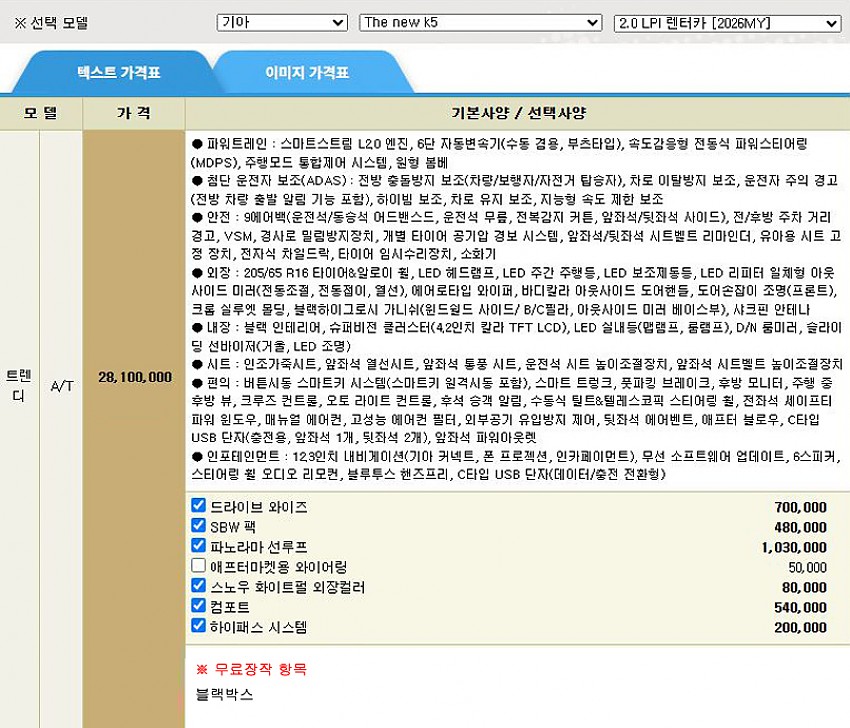 ▶ 차종 및 등급 : 기아 더 뉴 K5_2.0_LPI_렌터카_트렌디_26MY