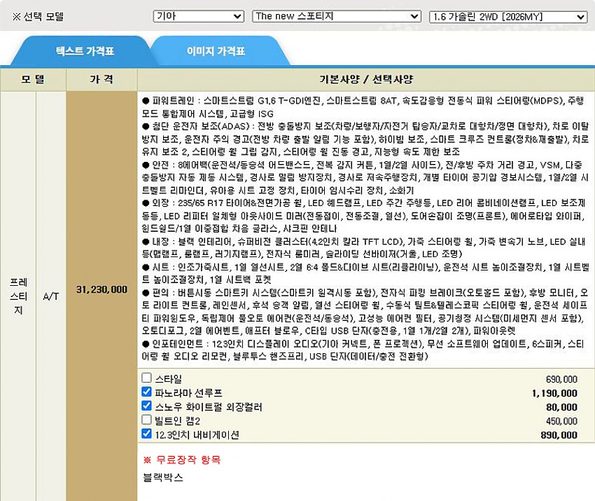 ▶ 차종 및 등급 : 더 뉴 스포티지 1.6 가솔린_2WD_프레스티지_26MY