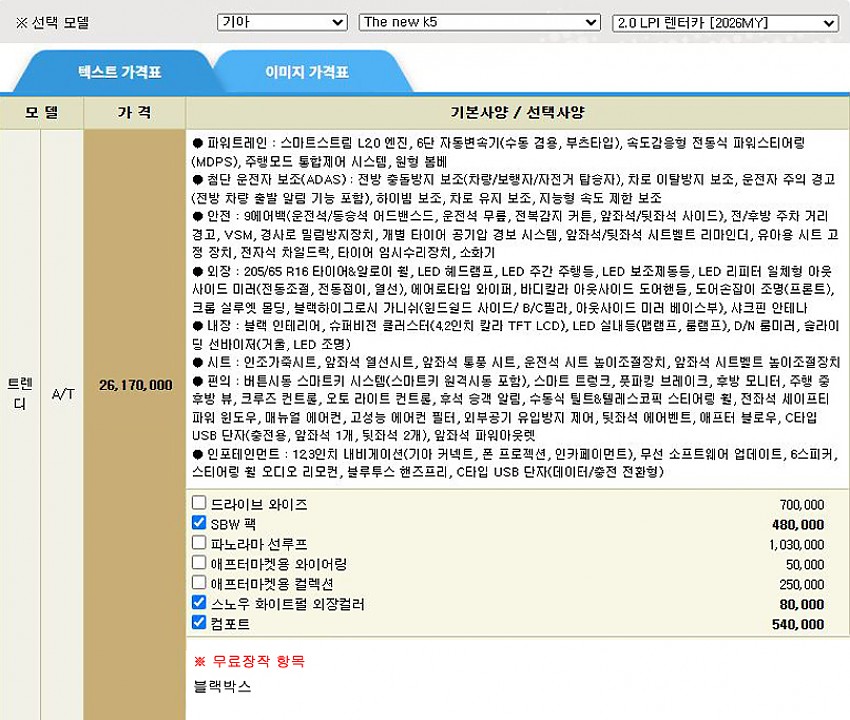 ▶ 차종 및 등급 : 더뉴 K5_2.0_LPI_렌터카_트렌디_26MY