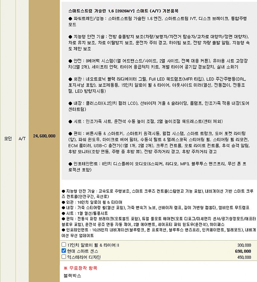 ▶ 차종 및 등급 : 더 뉴 아반떼_스마트스트림 가솔린 1.6_모던_2026MY
