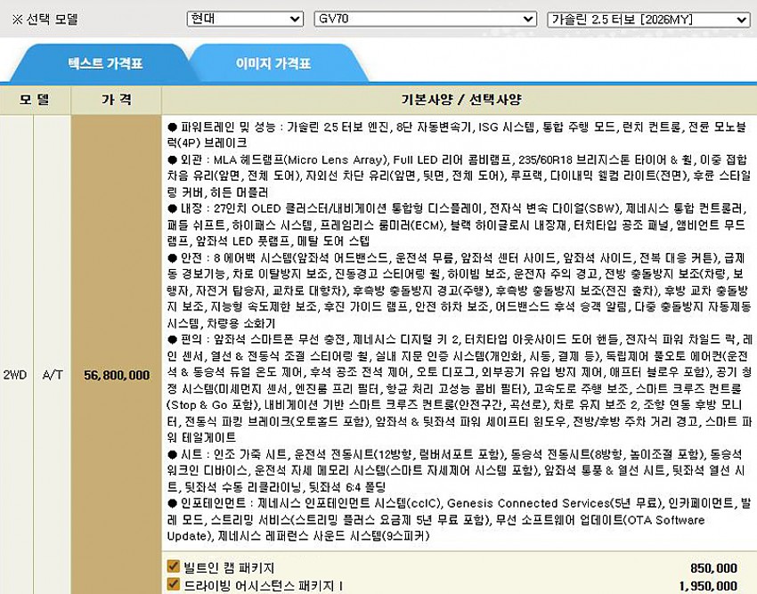 ▶ 차종 및 등급 : GV70_2.5T_가솔린_2WD_26MY