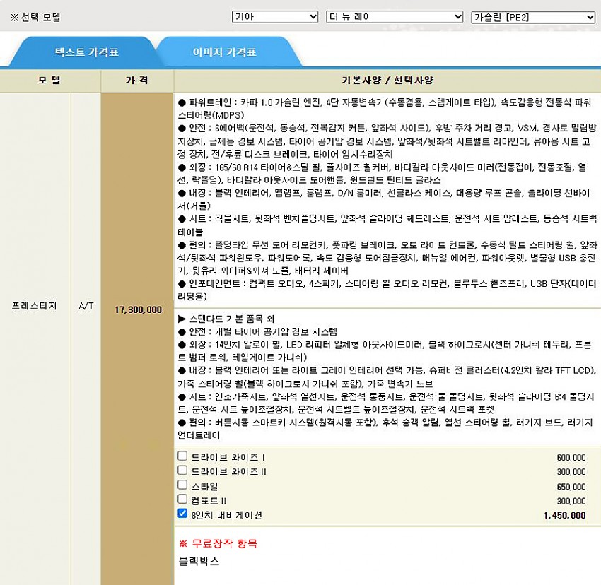 ▶ 차종 및 등급 : 더 뉴 레이 가솔린 프레스티지 (A/T PE2)