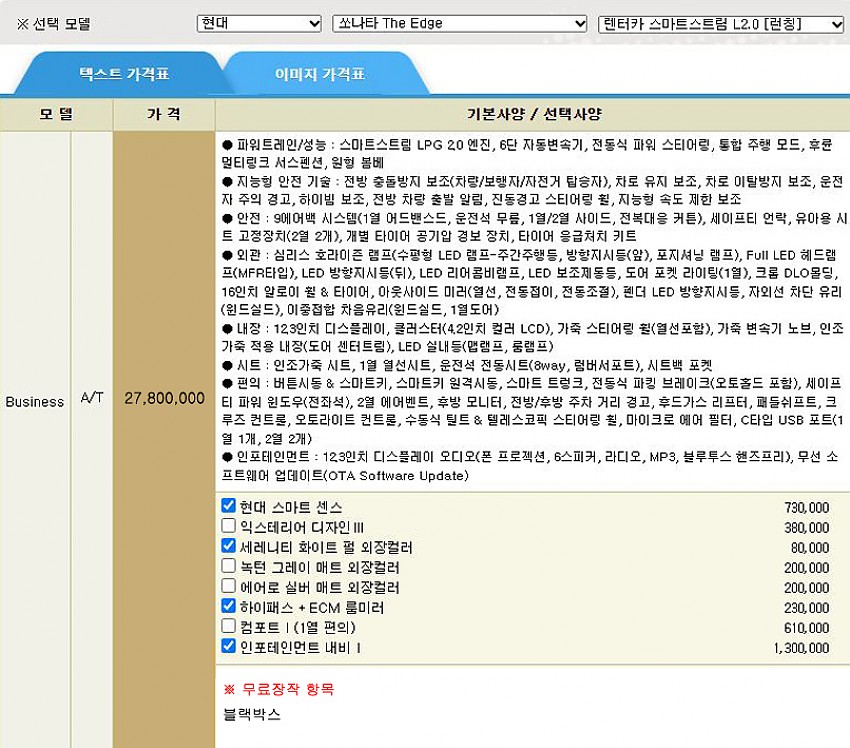 인포테인먼트 내비1 + 현대스마트센스 등 / 블랙박스(아래 옵션사항 참조)