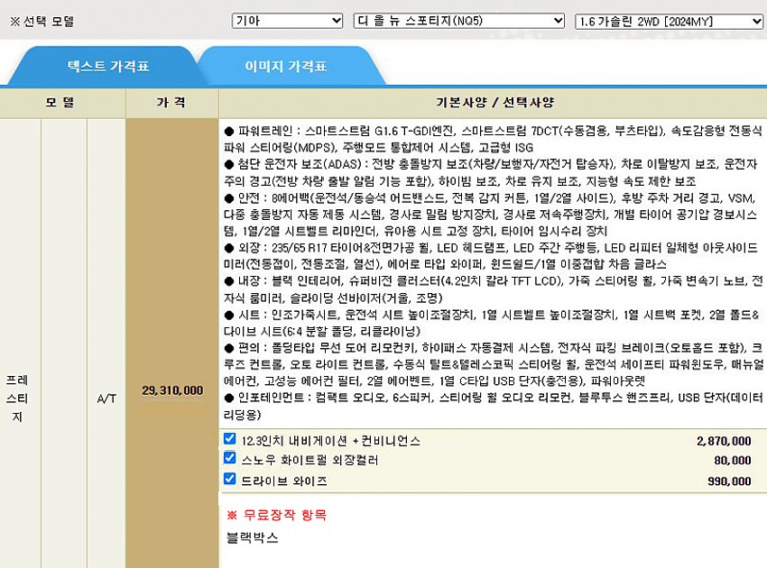 ▶ 차종 및 등급 : 디 올 뉴 스포티지_1.6 가솔린_2WD 프레스티지 24MY