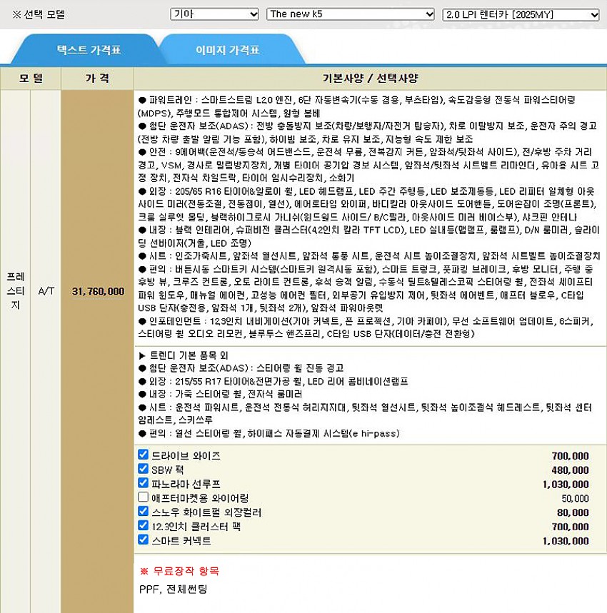 ▶ 차종 및 등급 : 더 뉴 K5_2.0_LPI 렌터카_프레스티지_25MY